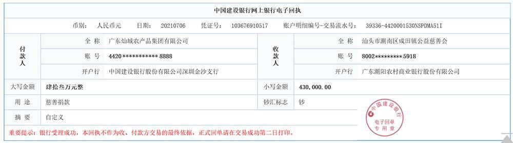 自2019年以來,廣東燦城集團在董事長李陽城的帶領下積極踐行企業(yè)社會責任,參與社會各類公益捐贈總額超過437萬元。其中向汕頭市潮南區(qū)成田鎮(zhèn)公益慈善會捐贈資金392.80萬元;向深圳市龍華區(qū)慈善會捐贈38.775萬元;向河源市和平縣財政局捐贈4.5萬元,幫助貧困學子成長成才;向布吉街道義工聯合會捐贈1萬元等等。
