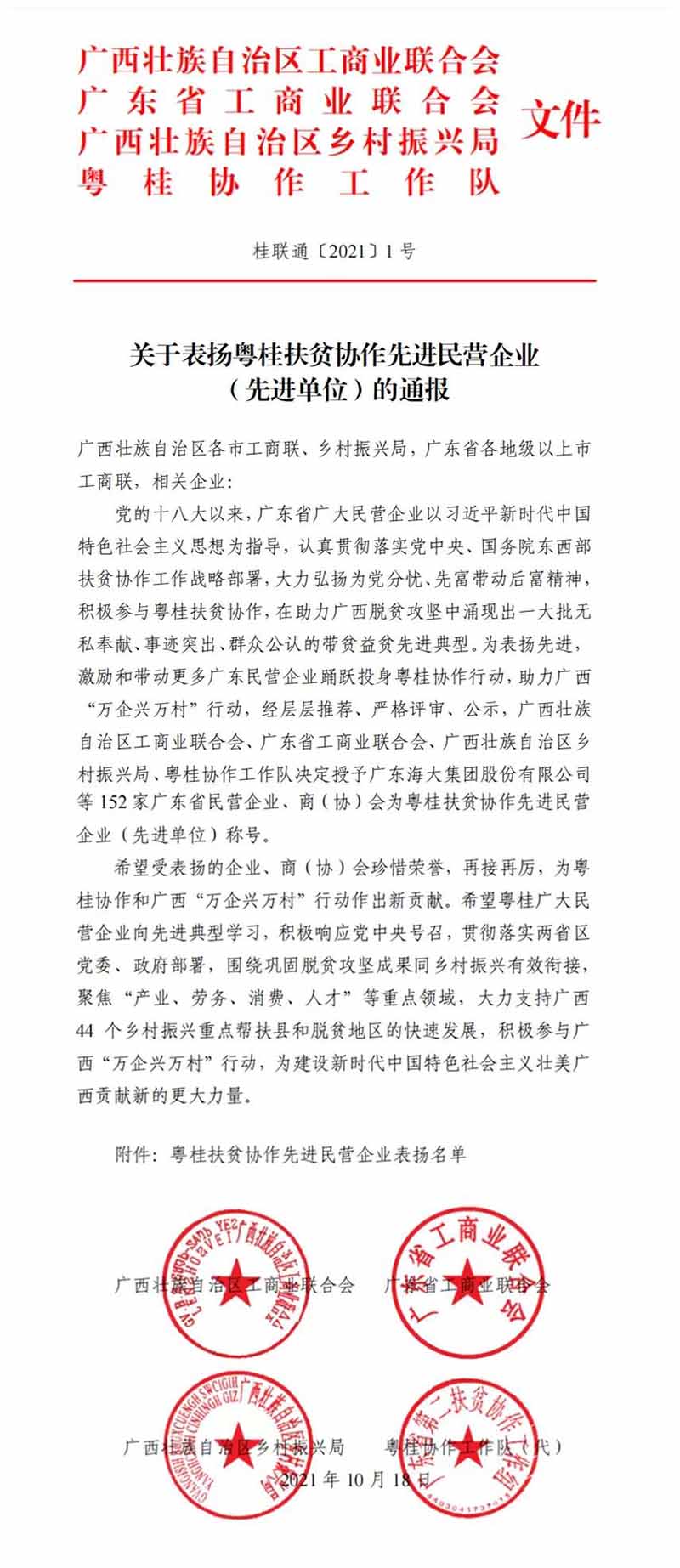 我司與其他151家企業(yè)、商協會被評為“粵桂扶貧協作先進民營企業(yè)(先進單位)”。