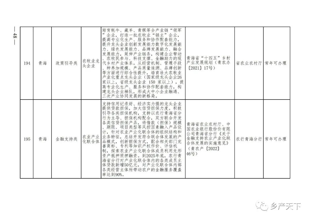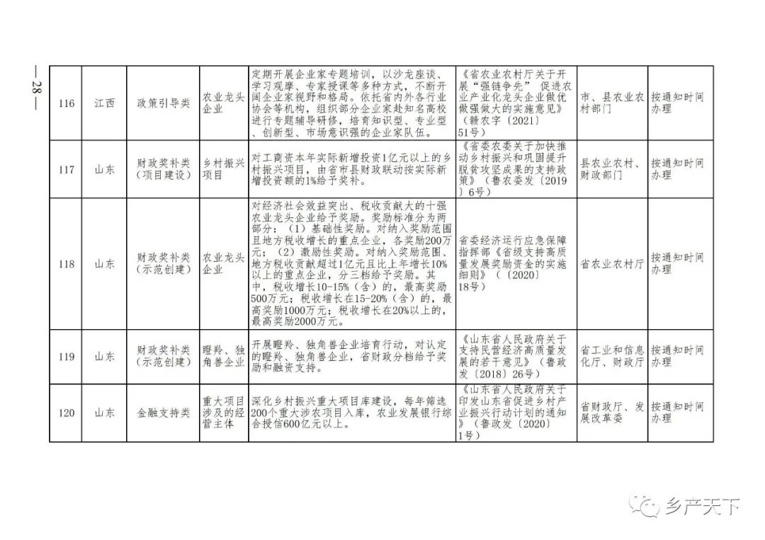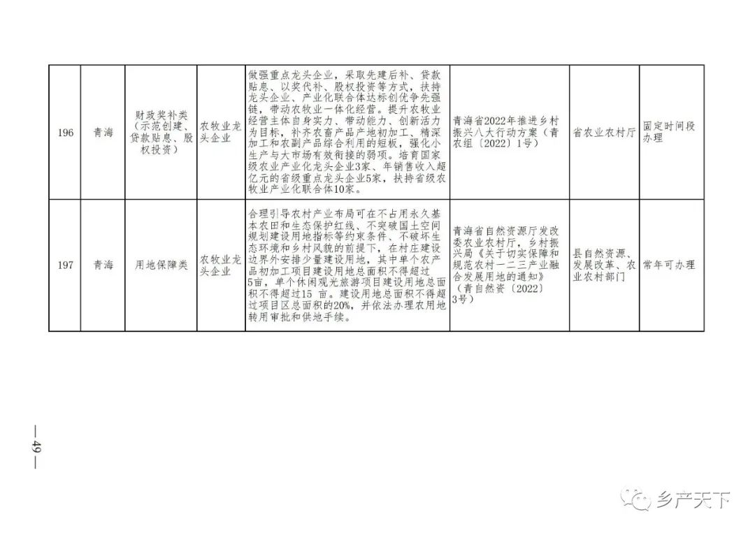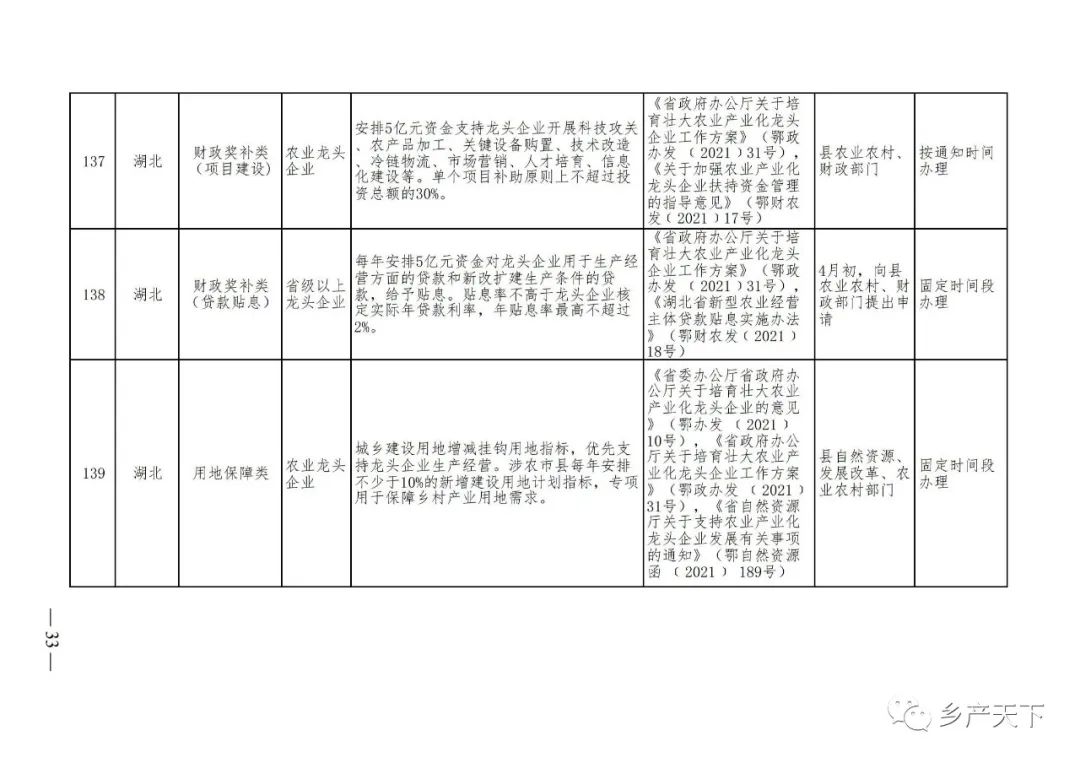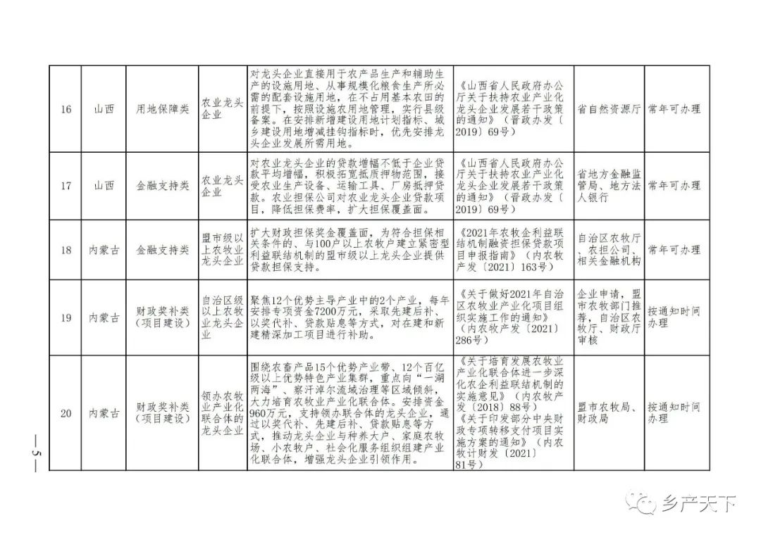 為加強對農業(yè)產(chǎn)業(yè)化龍頭企業(yè)的精準服務,農業(yè)農村部鄉(xiāng)村產(chǎn)業(yè)發(fā)展司收集了各?。▍^(qū)、市)對龍頭企業(yè)的支持政策,于近期印發(fā)《農業(yè)產(chǎn)業(yè)化龍頭企業(yè)支持政策清單》(簡稱《清單》),供各地互相參考學習。