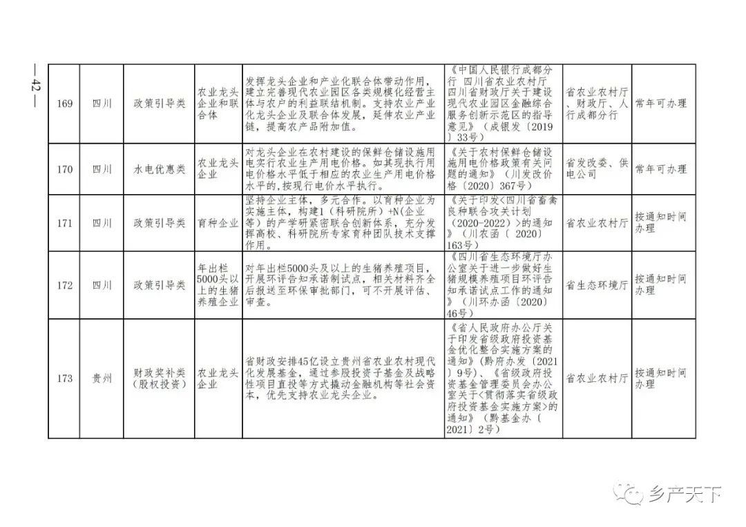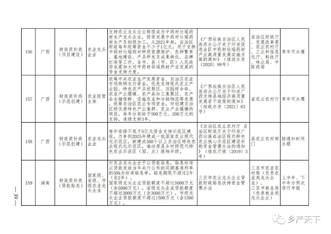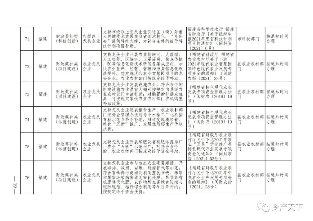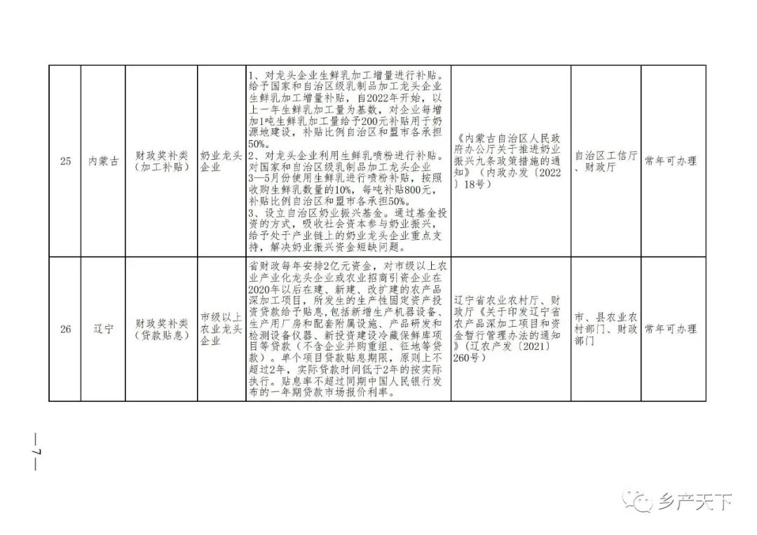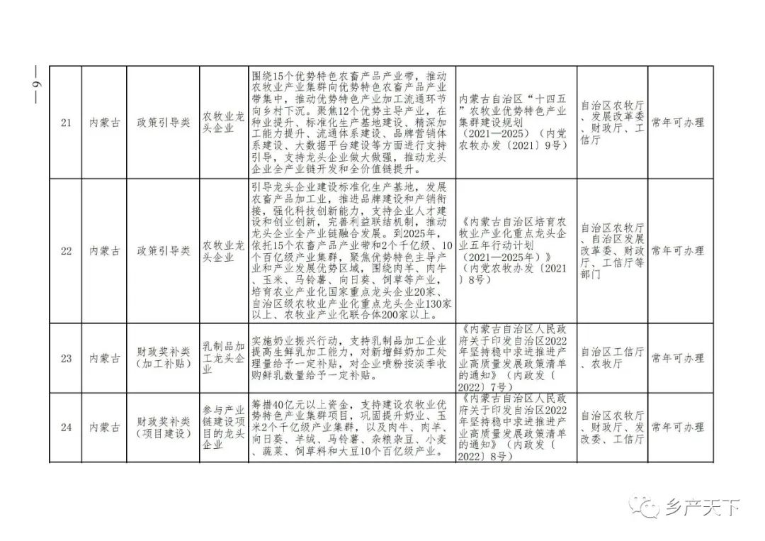 為加強對農業(yè)產(chǎn)業(yè)化龍頭企業(yè)的精準服務,農業(yè)農村部鄉(xiāng)村產(chǎn)業(yè)發(fā)展司收集了各?。▍^(qū)、市)對龍頭企業(yè)的支持政策,于近期印發(fā)《農業(yè)產(chǎn)業(yè)化龍頭企業(yè)支持政策清單》(簡稱《清單》),供各地互相參考學習。