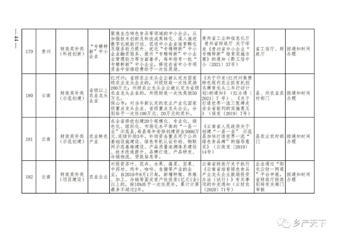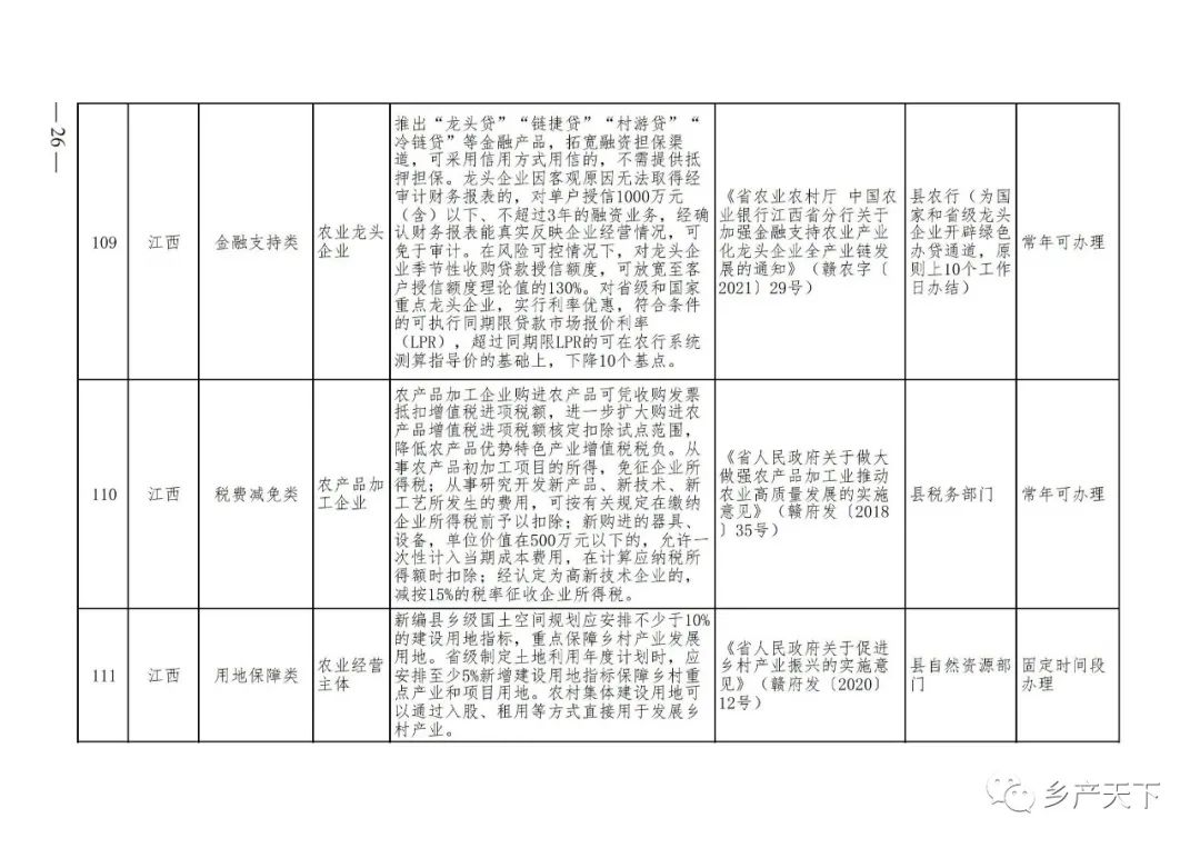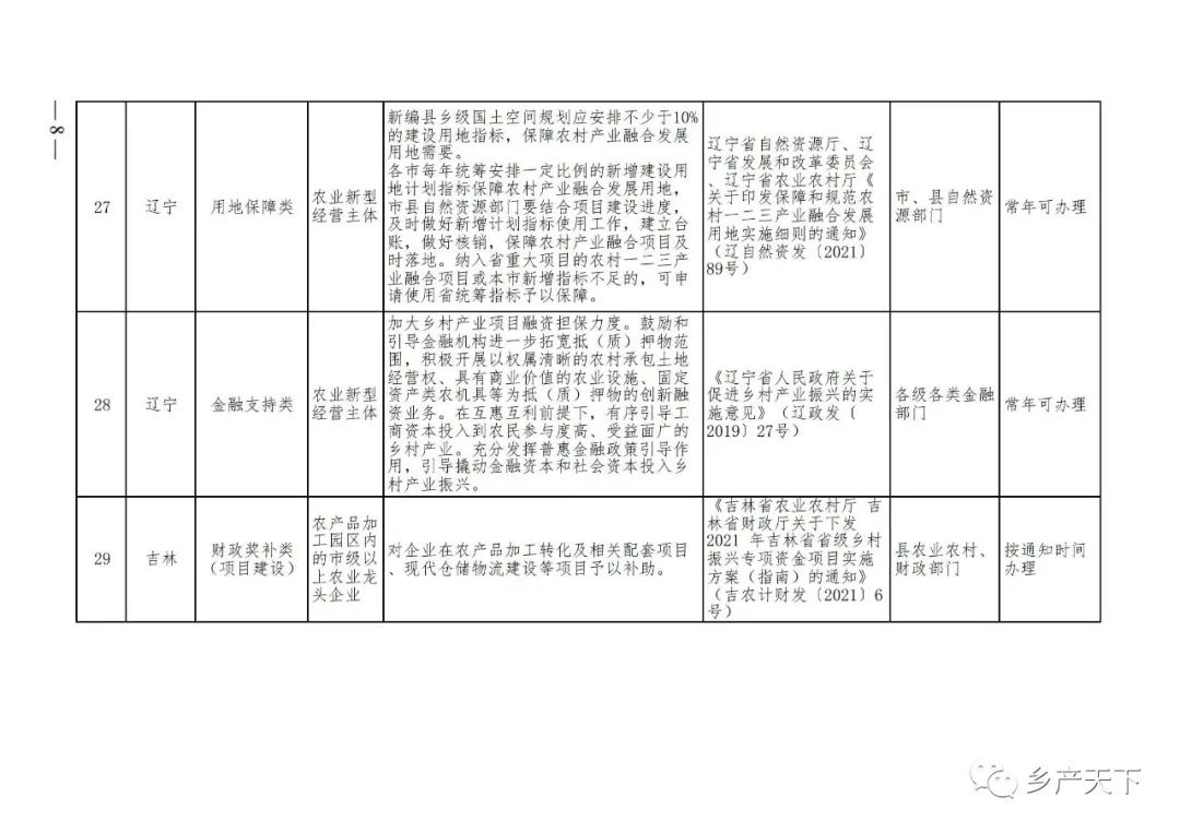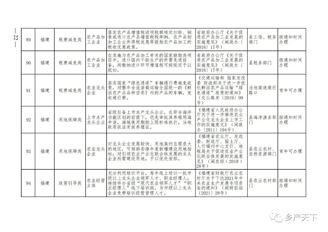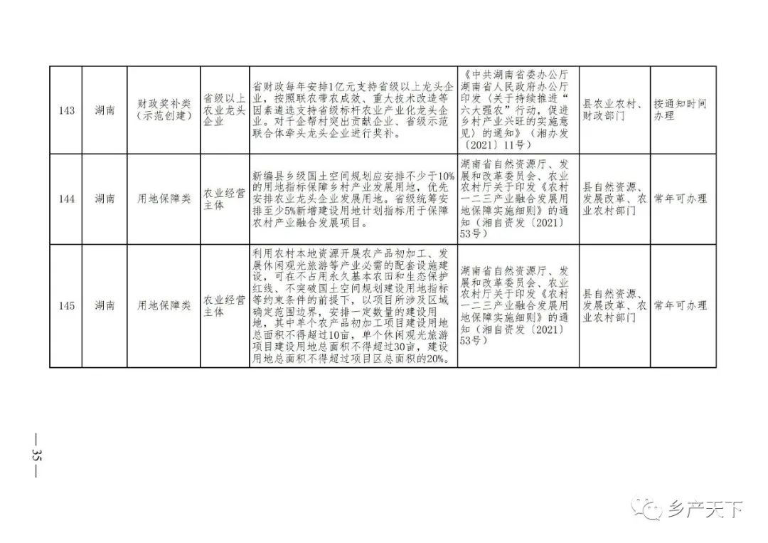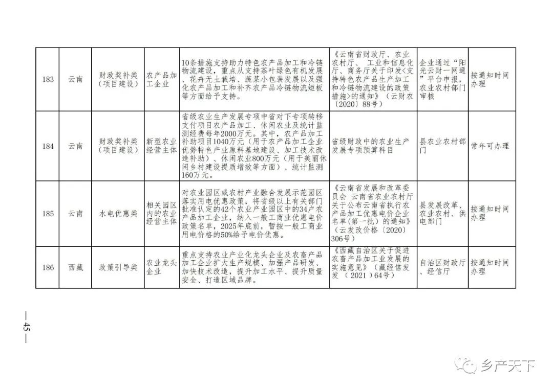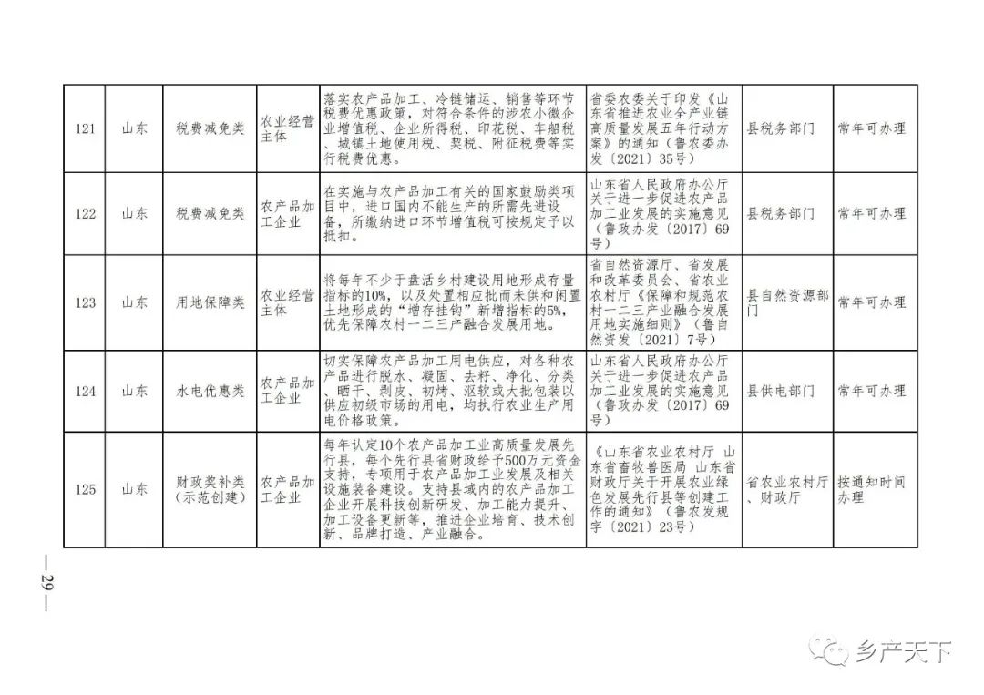 《清單》按照“政策類別、支持對象、具體內容、政策依據(jù)、辦理部門、辦理時間”進行梳理,共涉及“財政獎補、金融支持、用地保障、稅費減免、水電優(yōu)惠、政策引導”等六大類229條政策。《清單》通知,各地支持政策發(fā)生變化,要及時反饋,鄉(xiāng)村產(chǎn)業(yè)發(fā)展司將定期更新發(fā)布。