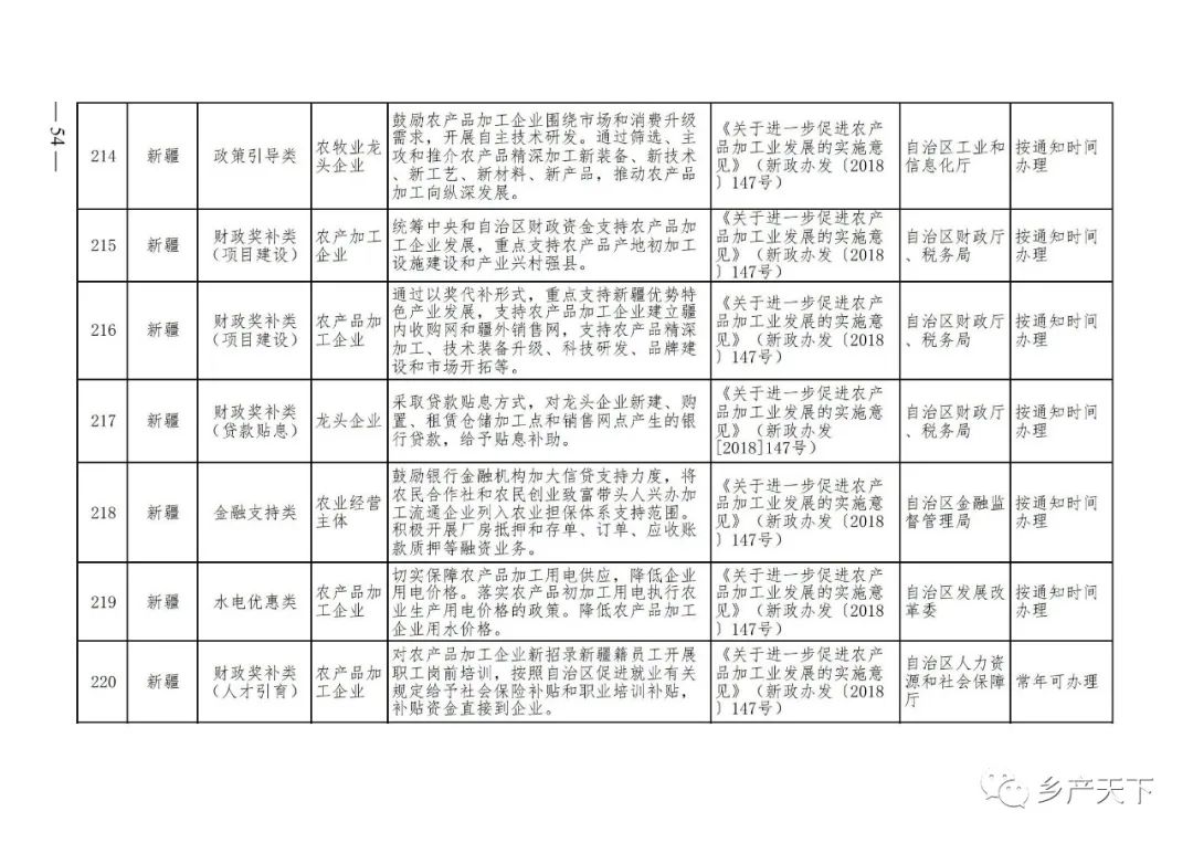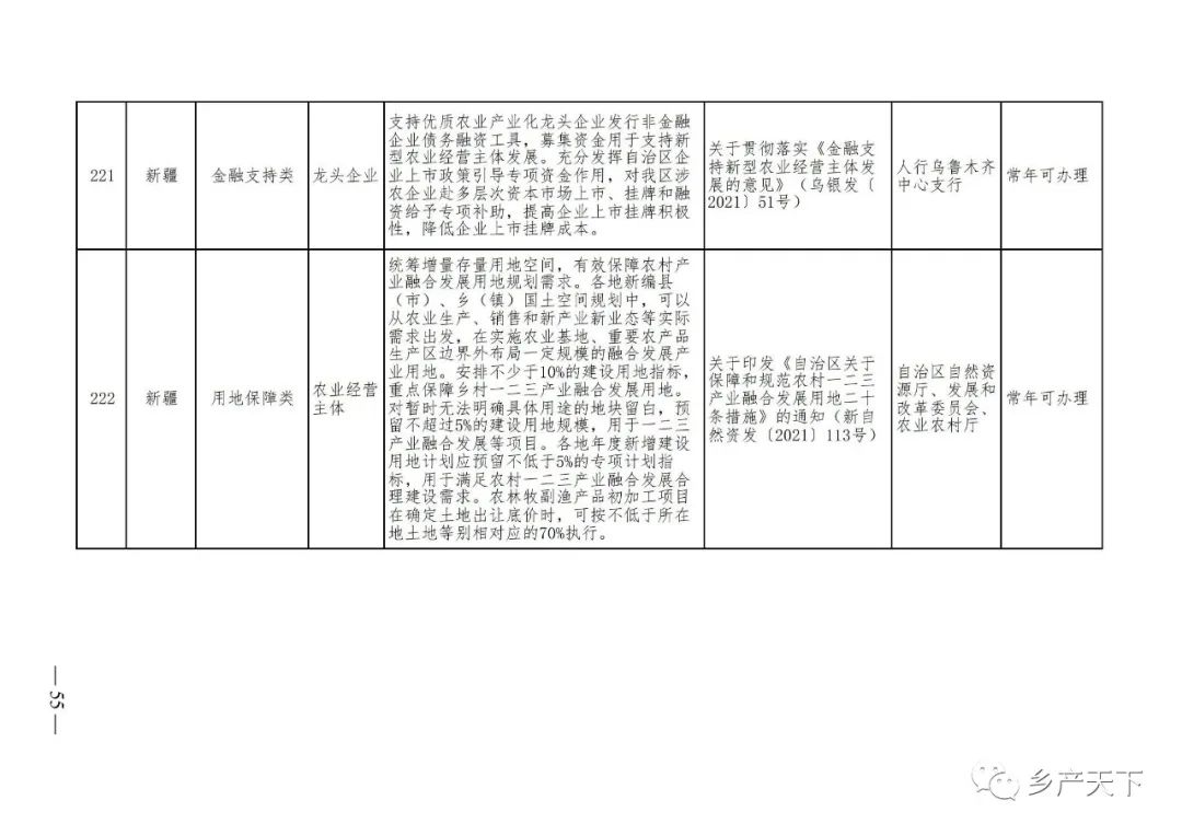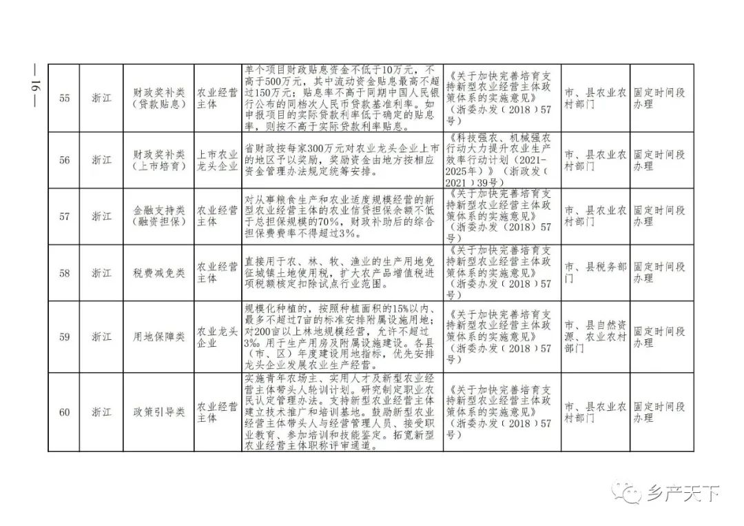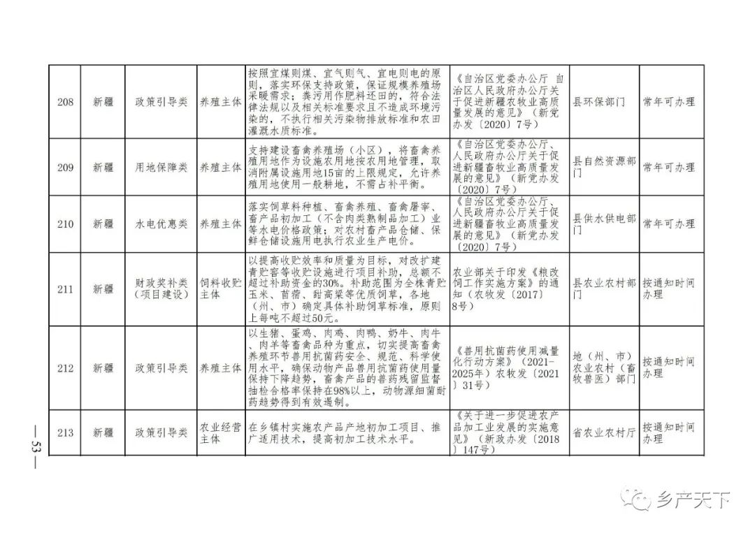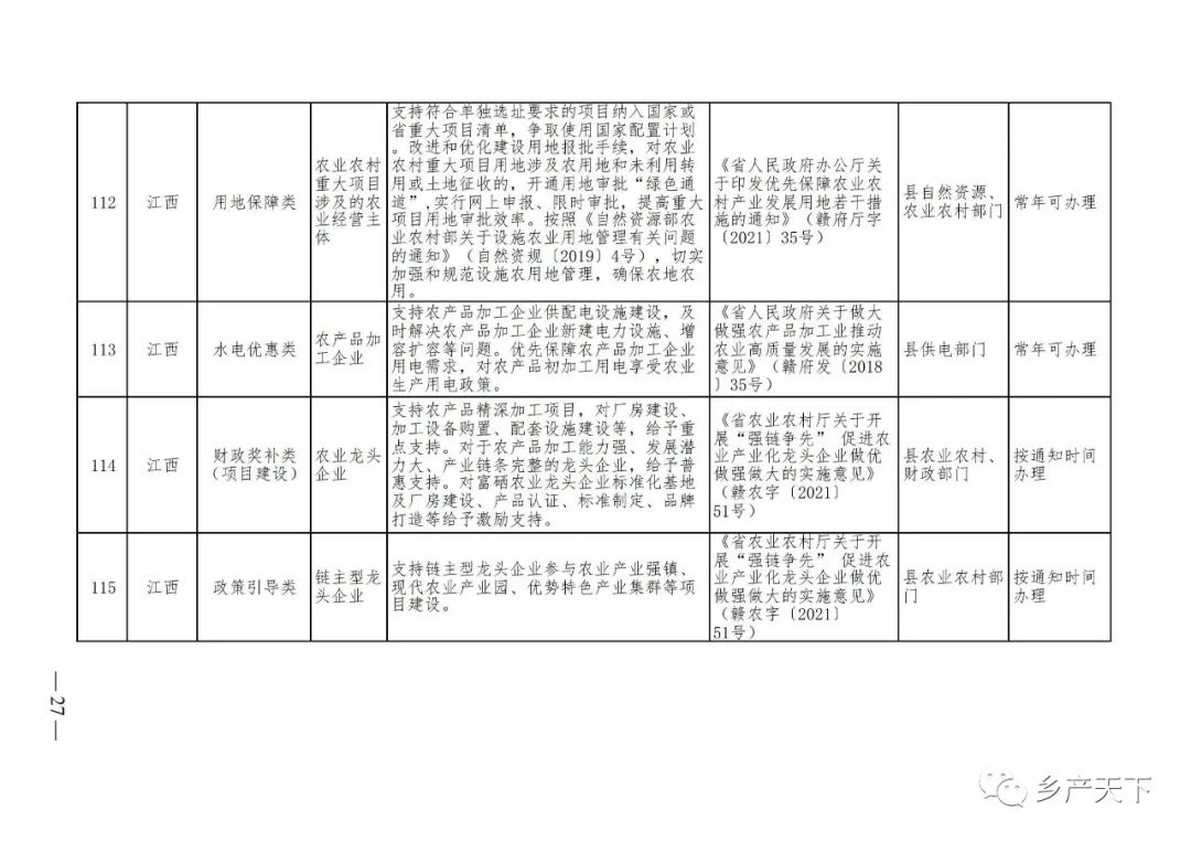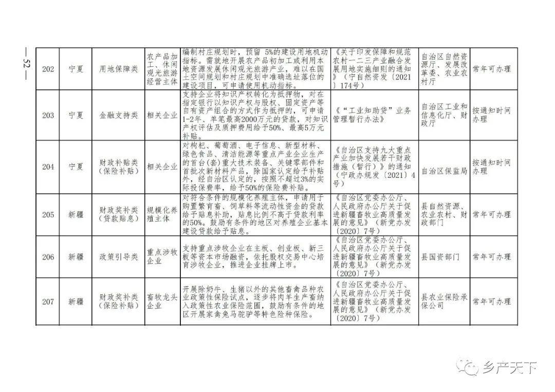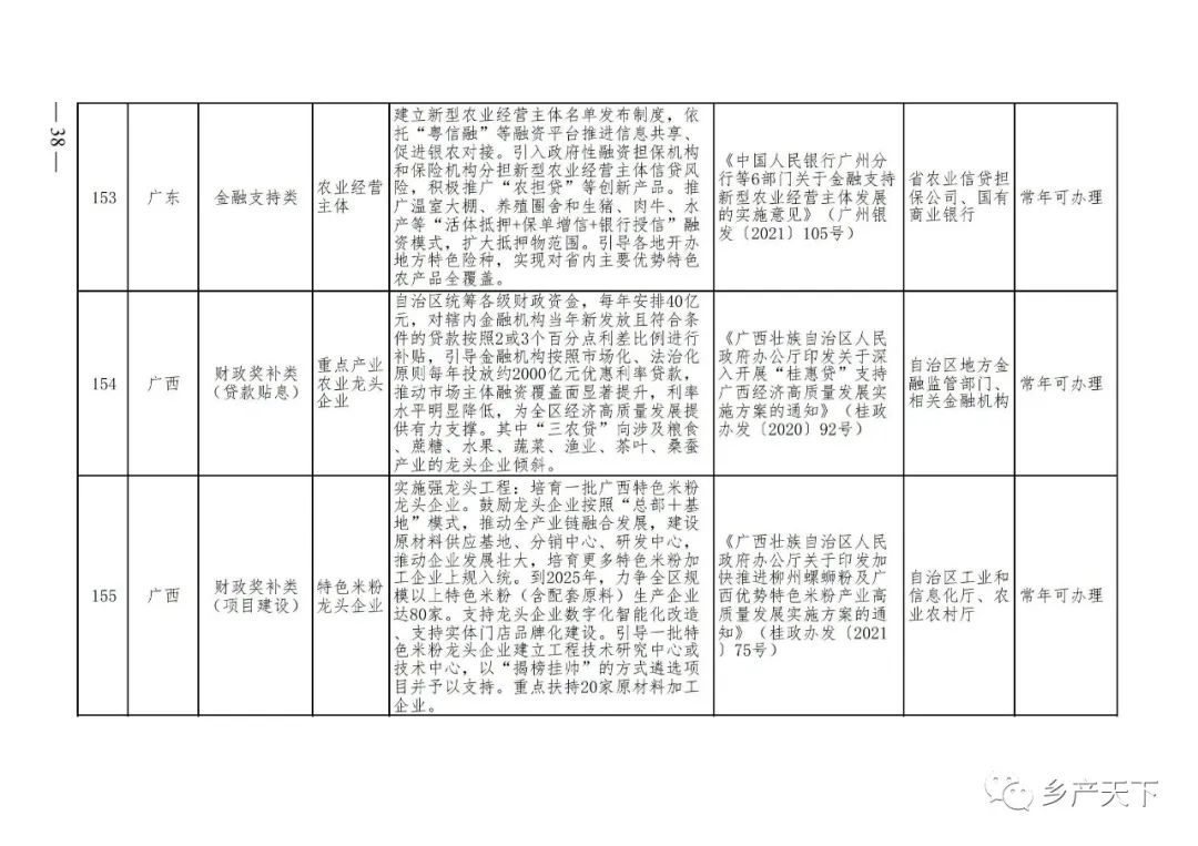 《清單》按照“政策類別、支持對象、具體內容、政策依據(jù)、辦理部門、辦理時間”進行梳理,共涉及“財政獎補、金融支持、用地保障、稅費減免、水電優(yōu)惠、政策引導”等六大類229條政策。《清單》通知,各地支持政策發(fā)生變化,要及時反饋,鄉(xiāng)村產(chǎn)業(yè)發(fā)展司將定期更新發(fā)布。