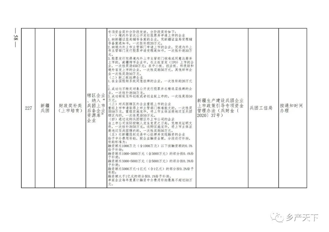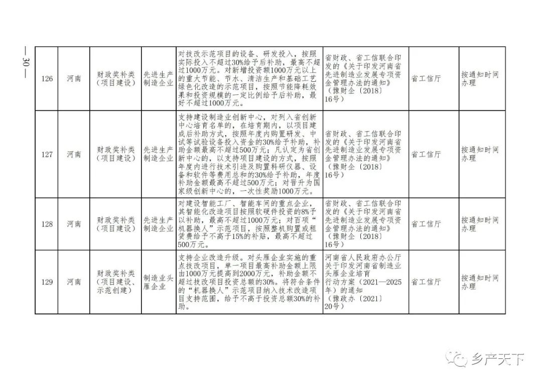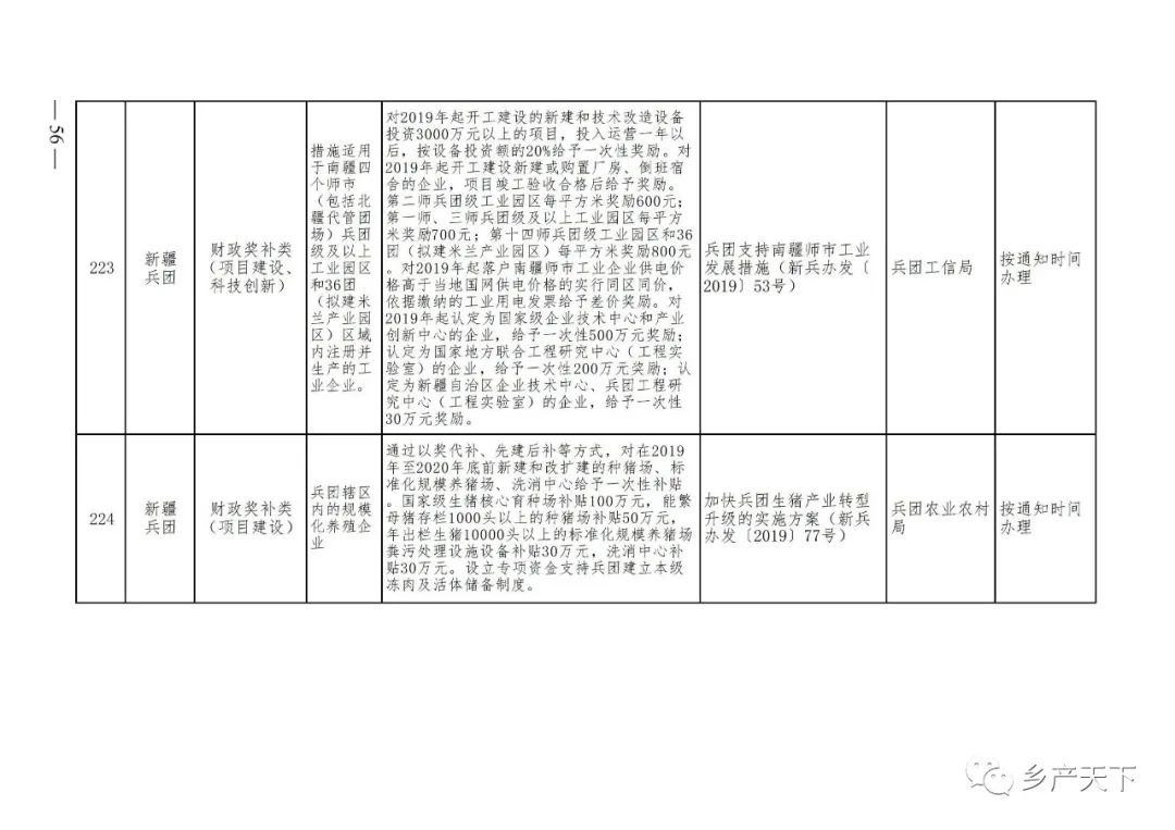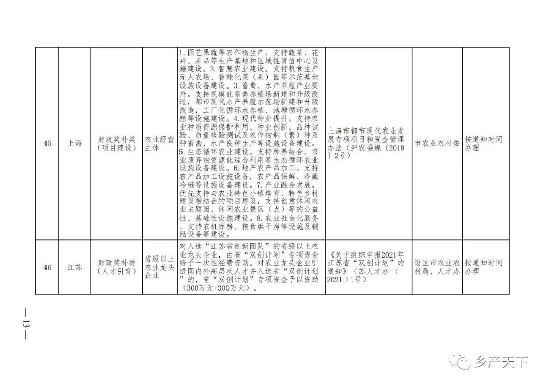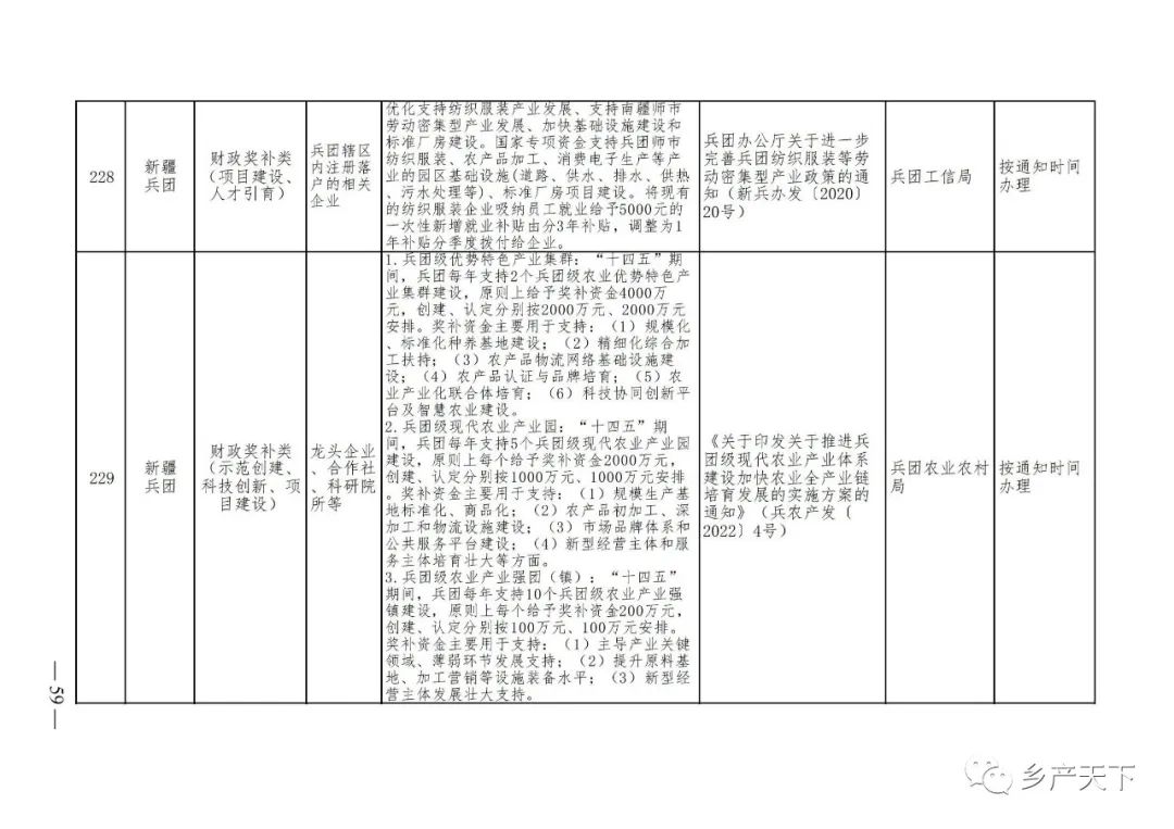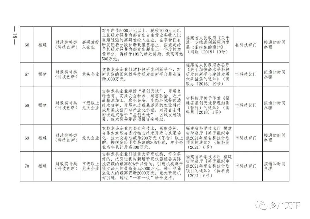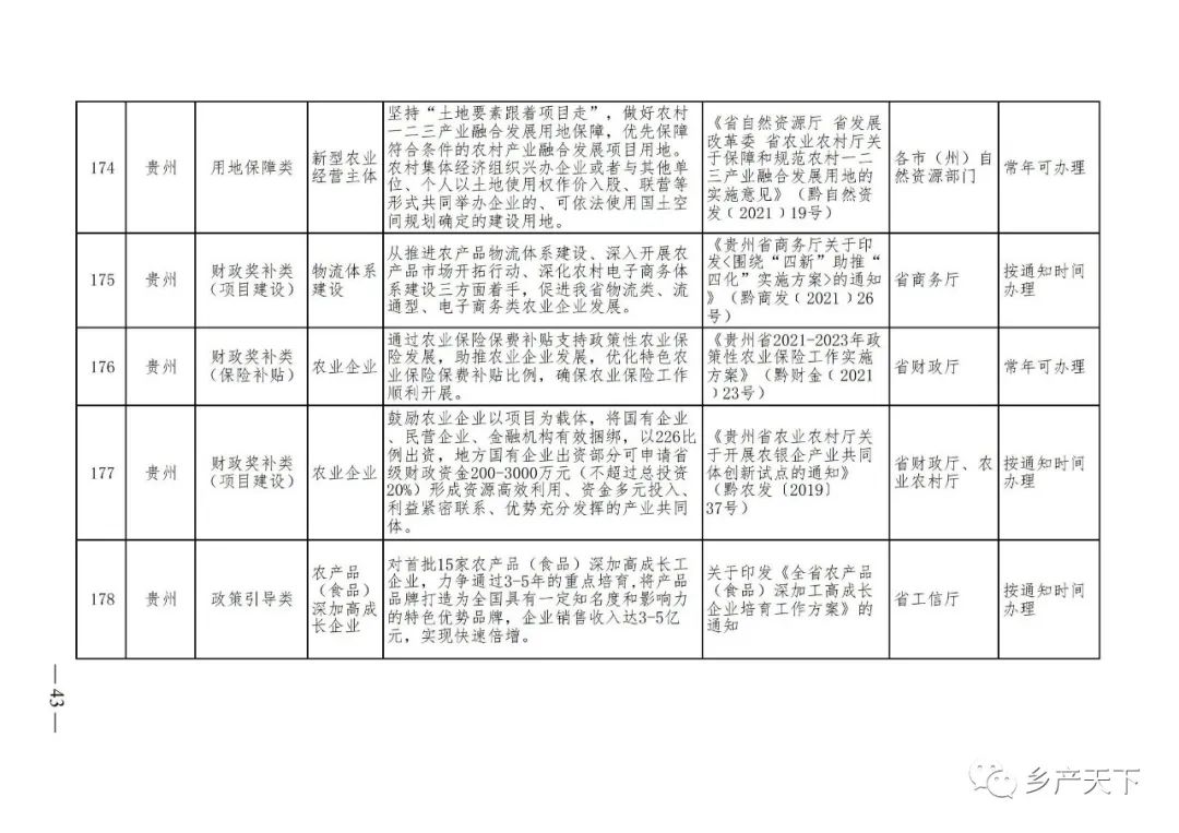 《清單》按照“政策類別、支持對象、具體內容、政策依據(jù)、辦理部門、辦理時間”進行梳理,共涉及“財政獎補、金融支持、用地保障、稅費減免、水電優(yōu)惠、政策引導”等六大類229條政策。《清單》通知,各地支持政策發(fā)生變化,要及時反饋,鄉(xiāng)村產(chǎn)業(yè)發(fā)展司將定期更新發(fā)布。